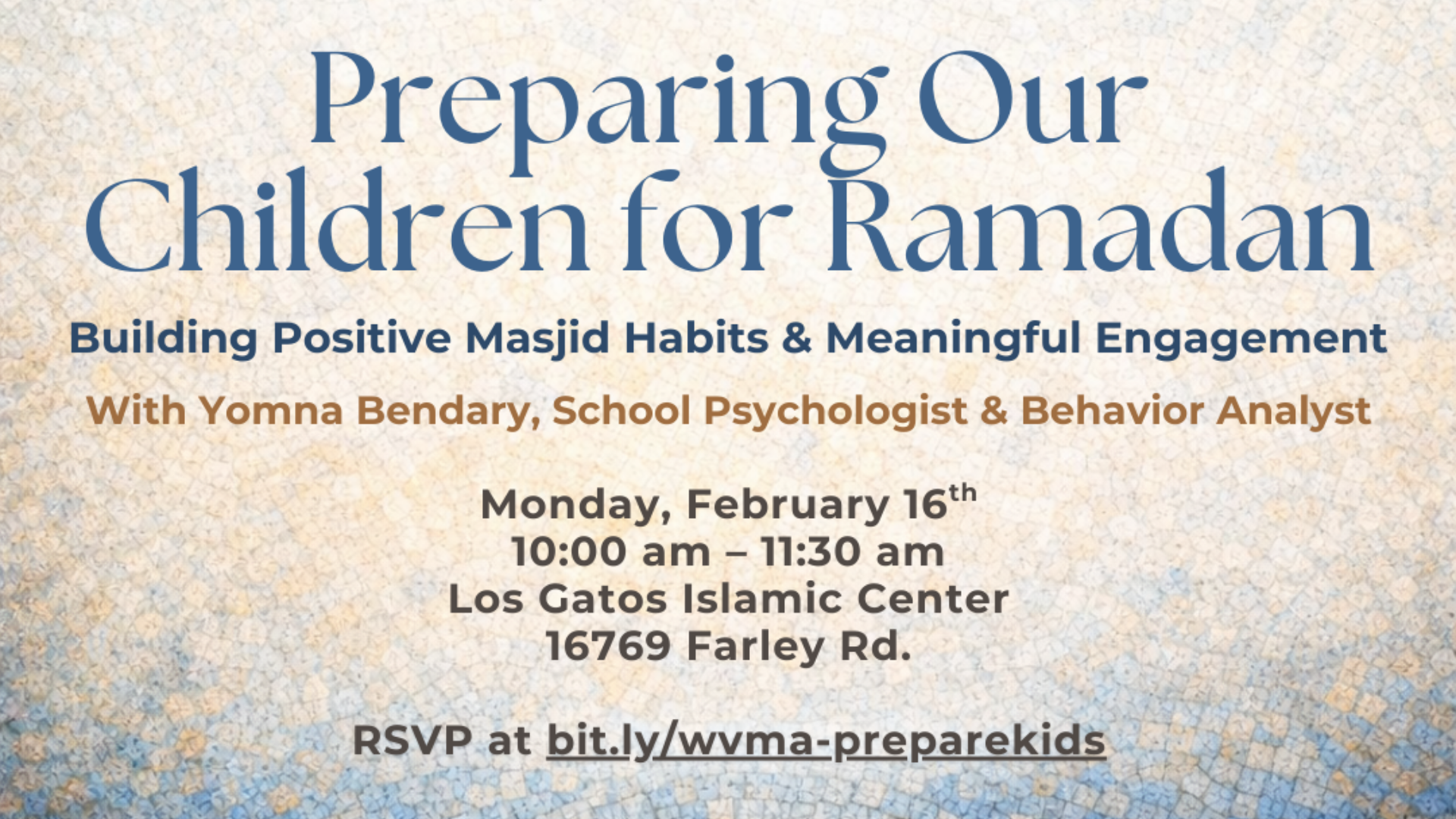This workshop is for parents looking to guide their children toward a positive and spiritually uplifting Ramadan. This...